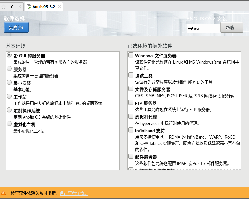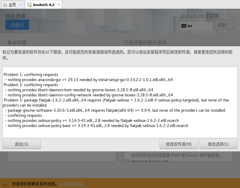 | 问题重现步骤 | 使用vmware workstation 16 建立虚拟机 挂载 AnolisOS-8.2-RC1-x86_64-dvd.iso 光盘镜像进行安装。 语言 > 简体中文 软件选择 > 基本环境 > 带GUI的服务器 (右侧未选择额外软件) 然后下方会出现下列告警: 检查软件依赖关系时出错。点击查看详情。 | ||||
