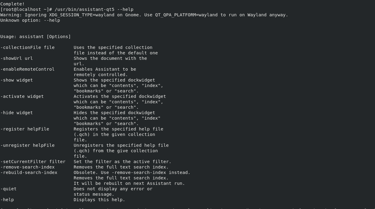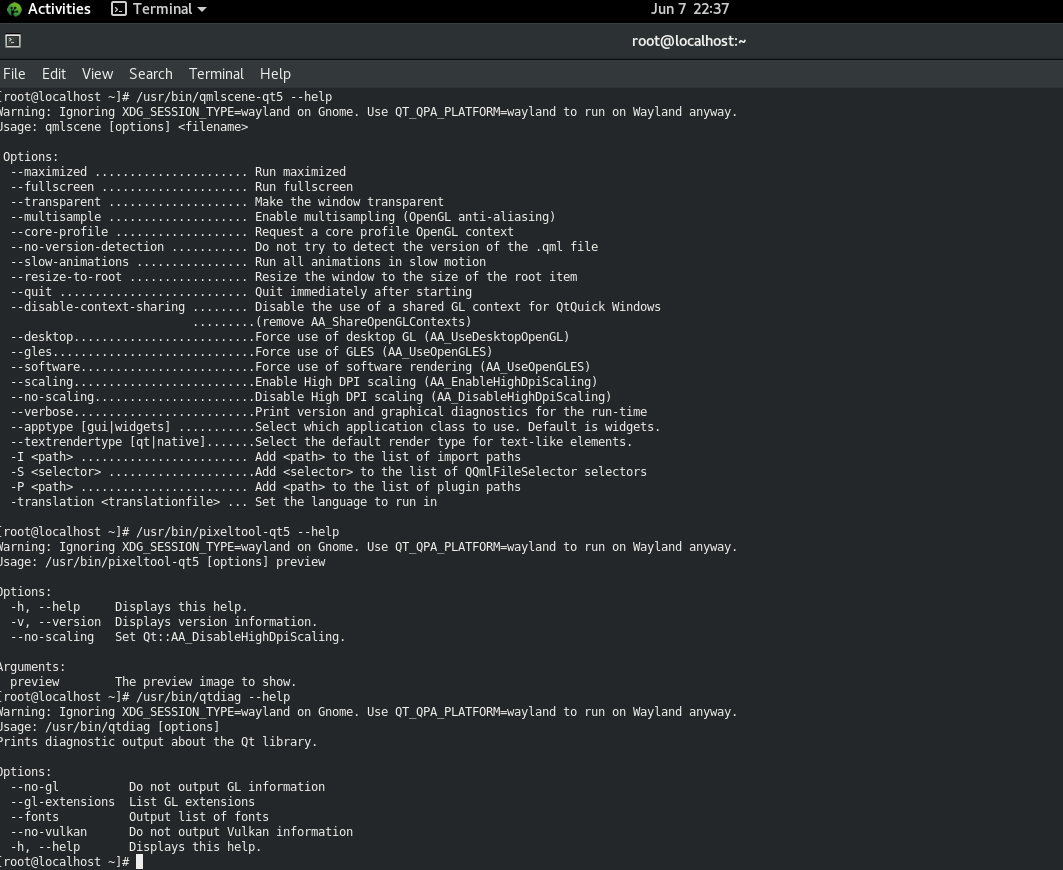 | 问题重现步骤 | yum install -y qt5-assistant /usr/bin/assistant-qt5 --help yum install -y qt5-designer /usr/bin/designer-qt5 --help yum install -y qt5-doctools /usr/bin/qdistancefieldgenerator --help yum install -y qt5-linguist /usr/bin/linguist-qt5 --help yum install -y qt5-qdbusviewer /usr/bin/qdbusviewer-qt5 --help yum install -y qt5-qtdeclarative-devel /usr/bin/qml --help /usr/bin/qml-qt5 --help /usr/bin/qmleasing --help /usr/bin/qmlscene --help /usr/bin/qmlscene-qt5 --help /usr/bin/qmltestrunner --help yum install -y qt5-qttools-devel /usr/bin/pixeltool-qt5 --help /usr/bin/qtdiag --help | ||||