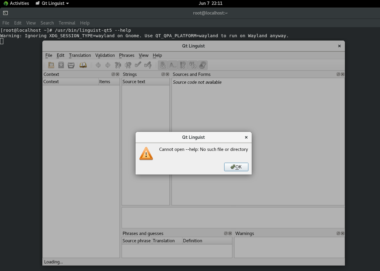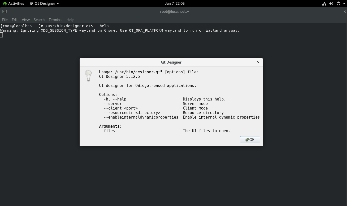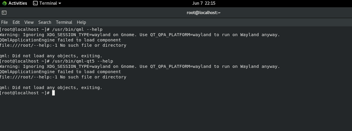 | 描述 | 安装 qt5-assistant-5.12.5-1.el8.x86_64 qt5-designer-5.12.5-1.el8.x86_64 qt5-doctools-5.12.5-1.el8.x86_64 qt5-linguist-5.12.5-1.el8.x86_64 qt5-qdbusviewer-5.12.5-1.el8.x86_64 qt5-qtdeclarative-devel-5.12.5-1.el8.x86_64 qt5-qttools-devel-5.12.5-1.el8.x86_64 这7个包后测试其中二进制文件发生core dump ,x86/arm均涉及 [环境信息]: 内核信息: [root@VM20210305-8]# uname -r 4.19.91-23.1.an8.x86_64 操作系统信息: # cat /etc/os-release NAME="Anolis OS" VERSION="8.2" ID="anolis" ID_LIKE="rhel fedora centos" VERSION_ID="8.2" PLATFORM_ID="platform:an8" PRETTY_NAME="Anolis OS 8.2" ANSI_COLOR="0;31" HOME_URL="https://openanolis.cn/" [期望结果]: 执行包中全部二进制文件不会发生core dump [实际结果]: 执行多个二进制文件发生core dump ---------- qt5-assistant: # /usr/bin/assistant-qt5 --help qt.qpa.xcb: could not connect to display qt.qpa.plugin: Could not load the Qt platform plugin "xcb" in "" even though it was found. This application failed to start because no Qt platform plugin could be initialized. Reinstalling the application may fix this problem. Available platform plugins are: eglfs, linuxfb, minimal, minimalegl, offscreen, vnc, xcb. Aborted (core dumped) ---------- qt5-designer: # /usr/bin/designer-qt5 --help qt.qpa.xcb: could not connect to display qt.qpa.plugin: Could not load the Qt platform plugin "xcb" in "" even though it was found. This application failed to start because no Qt platform plugin could be initialized. Reinstalling the application may fix this problem. Available platform plugins are: eglfs, linuxfb, minimal, minimalegl, offscreen, vnc, xcb. Aborted (core dumped) ---------- qt5-doctools: # /usr/bin/qdistancefieldgenerator --help qt.qpa.xcb: could not connect to display qt.qpa.plugin: Could not load the Qt platform plugin "xcb" in "" even though it was found. This application failed to start because no Qt platform plugin could be initialized. Reinstalling the application may fix this problem. Available platform plugins are: eglfs, linuxfb, minimal, minimalegl, offscreen, vnc, xcb. Aborted (core dumped) ---------- qt5-linguist: # /usr/bin/linguist-qt5 --help qt.qpa.xcb: could not connect to display qt.qpa.plugin: Could not load the Qt platform plugin "xcb" in "" even though it was found. This application failed to start because no Qt platform plugin could be initialized. Reinstalling the application may fix this problem. Available platform plugins are: eglfs, linuxfb, minimal, minimalegl, offscreen, vnc, xcb. Aborted (core dumped) ---------- qt5-qdbusviewer: # /usr/bin/qdbusviewer-qt5 --help qt.qpa.xcb: could not connect to display qt.qpa.plugin: Could not load the Qt platform plugin "xcb" in "" even though it was found. This application failed to start because no Qt platform plugin could be initialized. Reinstalling the application may fix this problem. Available platform plugins are: eglfs, linuxfb, minimal, minimalegl, offscreen, vnc, xcb. Aborted (core dumped) ---------- qt5-qtdeclarative-devel: # /usr/bin/qml --help qt.qpa.xcb: could not connect to display qt.qpa.plugin: Could not load the Qt platform plugin "xcb" in "" even though it was found. This application failed to start because no Qt platform plugin could be initialized. Reinstalling the application may fix this problem. Available platform plugins are: eglfs, linuxfb, minimal, minimalegl, offscreen, vnc, xcb. Aborted (core dumped) # /usr/bin/qml-qt5 --help qt.qpa.xcb: could not connect to display qt.qpa.plugin: Could not load the Qt platform plugin "xcb" in "" even though it was found. This application failed to start because no Qt platform plugin could be initialized. Reinstalling the application may fix this problem. Available platform plugins are: eglfs, linuxfb, minimal, minimalegl, offscreen, vnc, xcb. Aborted (core dumped) # /usr/bin/qmleasing --help qt.qpa.xcb: could not connect to display qt.qpa.plugin: Could not load the Qt platform plugin "xcb" in "" even though it was found. This application failed to start because no Qt platform plugin could be initialized. Reinstalling the application may fix this problem. Available platform plugins are: eglfs, linuxfb, minimal, minimalegl, offscreen, vnc, xcb. Aborted (core dumped) # /usr/bin/qmlscene --help qt.qpa.xcb: could not connect to display qt.qpa.plugin: Could not load the Qt platform plugin "xcb" in "" even though it was found. This application failed to start because no Qt platform plugin could be initialized. Reinstalling the application may fix this problem. Available platform plugins are: eglfs, linuxfb, minimal, minimalegl, offscreen, vnc, xcb. Aborted (core dumped) # /usr/bin/qmlscene-qt5 --help qt.qpa.xcb: could not connect to display qt.qpa.plugin: Could not load the Qt platform plugin "xcb" in "" even though it was found. This application failed to start because no Qt platform plugin could be initialized. Reinstalling the application may fix this problem. Available platform plugins are: eglfs, linuxfb, minimal, minimalegl, offscreen, vnc, xcb. Aborted (core dumped) # /usr/bin/qmltestrunner --help qt.qpa.xcb: could not connect to display qt.qpa.plugin: Could not load the Qt platform plugin "xcb" in "" even though it was found. This application failed to start because no Qt platform plugin could be initialized. Reinstalling the application may fix this problem. Available platform plugins are: eglfs, linuxfb, minimal, minimalegl, offscreen, vnc, xcb. Aborted (core dumped) ---------- qt5-qttools-devel: # /usr/bin/pixeltool-qt5 --help qt.qpa.xcb: could not connect to display qt.qpa.plugin: Could not load the Qt platform plugin "xcb" in "" even though it was found. This application failed to start because no Qt platform plugin could be initialized. Reinstalling the application may fix this problem. Available platform plugins are: eglfs, linuxfb, minimal, minimalegl, offscreen, vnc, xcb. Aborted (core dumped) # /usr/bin/qtdiag --help qt.qpa.xcb: could not connect to display qt.qpa.plugin: C