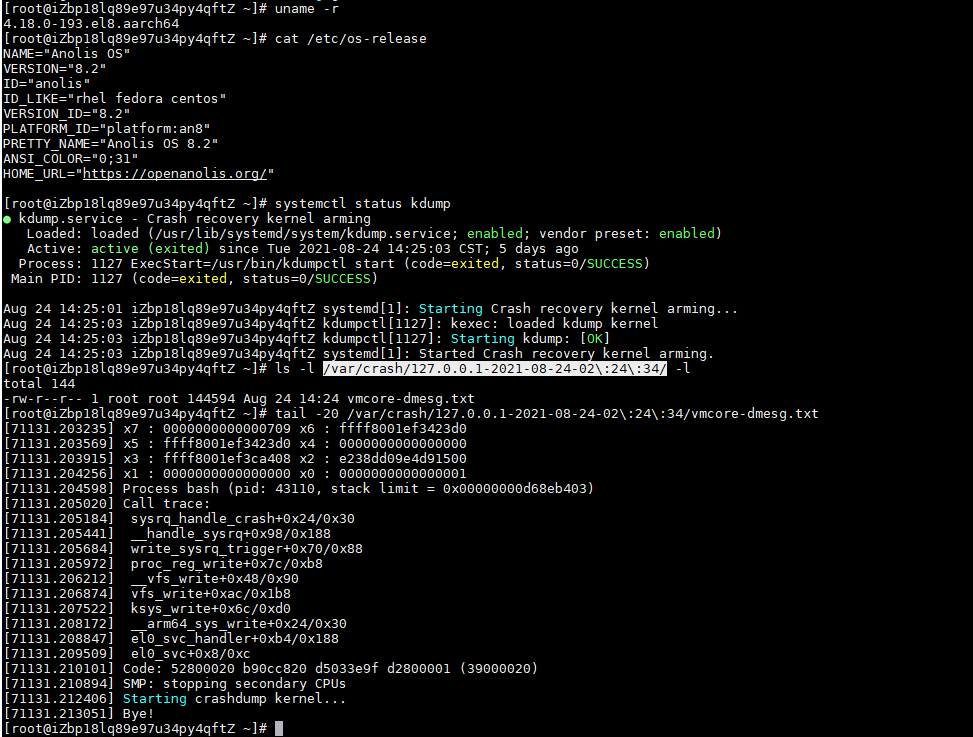 | 描述 | [缺陷描述]: 使用Anolis arm64 4.18内核的镜像 anolisos_8_2_arm64_20G_rhck_alibase_20210802.vhd anolisos_8_4_arm64_20G_rhck_alibase_20210802.vhd 创建云上实例后,kdump服务正常情况下触发异常后未能生成vmcore [重现概率] 必现 [重现环境] 线上ecs实例,aarch64 OS: Anolis OS release 8.2 Anolis OS release 8.4 kernel: 4.18.0-305.an8.aarch64 [期望结果]: kdump服务状态正常 触发系统异常后,可在指定目录下生成内核异常转储文件vmcore [实际结果]: /var/crash目录下只有vmcore-dmesg.txt文件,而无vmcore 在创建的所有规格实例上均可发现 | ||||