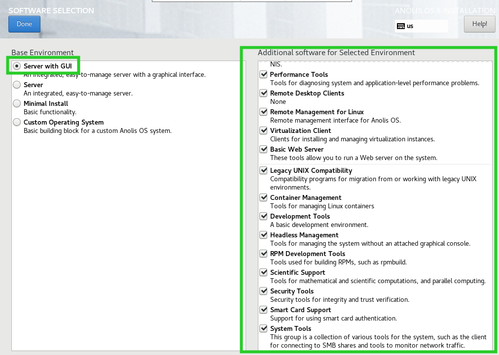 | 问题重现步骤 | 使用QU1 ISO aarch64/x86_64镜像安装时选择内核”4.18 rhck”,软件安装“server for GUI”(勾选右侧全部组件) | ||||