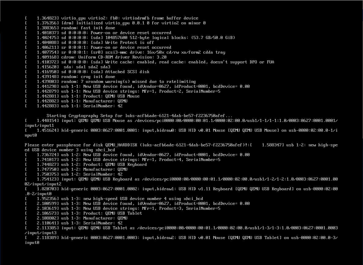 | 问题重现步骤 | [前置条件] 进入图形化安装界面 [步骤] 1. 在图形化安装界面,其他项默认配置,点击“安装目的地”项 2. 在弹出的“安装目标位置”对话框,选择加密—加密我的数据,其他项默认配置,点击完成,设置磁盘加密口令。 3. 点击“开始安装”按钮,安装完成后,点击“重启”按钮 4. 重启后进入到磁盘解密的对话框,输入口令。 [结果] 1. 点击重启之,进入引导之后无法进入系统,见附件 [期望] 1. 弹出“安装目标位置”对话框 2. 加密我的数据被勾选,磁盘口令设置成功,配置完成。 3. 系统安装成功,系统重启 4. 进入系统。 | ||||