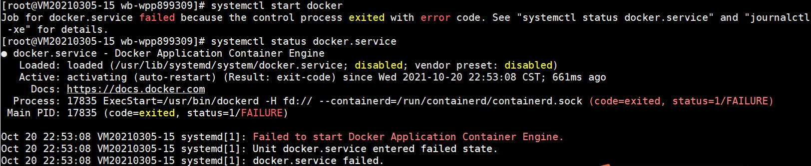| 描述 | [缺陷描述] 安装docker-ce相关软件包后,systemctl start docker启动服务失败 错误如下: # systemctl start docker Job for docker.service failed because the control process exited with error code. See "systemctl status docker.service" and "journalctl -xe" for details. [root@VM20210305-15 bin]# systemctl status docker.service ● docker.service - Docker Application Container Engine Loaded: loaded (/usr/lib/systemd/system/docker.service; disabled; vendor preset: disabled) Active: failed (Result: start-limit) since Wed 2021-10-20 22:43:38 CST; 3s ago Docs: https://docs.docker.com Process: 10884 ExecStart=/usr/bin/dockerd -H fd:// --containerd=/run/containerd/containerd.sock (code=exited, status=1/FAILURE) Main PID: 10884 (code=exited, status=1/FAILURE) Oct 20 22:43:36 VM20210305-15 systemd[1]: Failed to start Docker Application Container Engine. Oct 20 22:43:36 VM20210305-15 systemd[1]: Unit docker.service entered failed state. Oct 20 22:43:36 VM20210305-15 systemd[1]: docker.service failed. Oct 20 22:43:38 VM20210305-15 systemd[1]: docker.service holdoff time over, scheduling restart. Oct 20 22:43:38 VM20210305-15 systemd[1]: Stopped Docker Application Container Engine. Oct 20 22:43:38 VM20210305-15 systemd[1]: start request repeated too quickly for docker.service Oct 20 22:43:38 VM20210305-15 systemd[1]: Failed to start Docker Application Container Engine. Oct 20 22:43:38 VM20210305-15 systemd[1]: Unit docker.service entered failed state. Oct 20 22:43:38 VM20210305-15 systemd[1]: docker.service failed. [重现概率] 必现 [重现环境] # cat /etc/os-release NAME="Anolis OS" VERSION="7.7" ID="anolis" ID_LIKE="rhel fedora centos" VERSION_ID="7.7" PRETTY_NAME="Anolis OS 7.7" ANSI_COLOR="0;31" HOME_URL="https://openanolis.cn/" BUG_REPORT_URL="https://bugs.openanolis.cn/" CENTOS_MANTISBT_PROJECT="CentOS-7" CENTOS_MANTISBT_PROJECT_VERSION="7" REDHAT_SUPPORT_PRODUCT="centos" REDHAT_SUPPORT_PRODUCT_VERSION="7" # uname -r 4.19.91-24.8.an7.x86_64 # lscpu Architecture: x86_64 CPU op-mode(s): 32-bit, 64-bit Byte Order: Little Endian CPU(s): 4 On-line CPU(s) list: 0-3 Thread(s) per core: 2 Core(s) per socket: 1 Socket(s): 2 NUMA node(s): 1 Vendor ID: GenuineIntel CPU family: 6 Model: 85 Model name: Intel(R) Xeon(R) Platinum 8269CY CPU @ 2.50GHz Stepping: 7 CPU MHz: 2500.000 BogoMIPS: 5000.00 Hypervisor vendor: KVM Virtualization type: full L1d cache: 32K L1i cache: 32K L2 cache: 1024K L3 cache: 36608K NUMA node0 CPU(s): 0-3 Flags: fpu vme de pse tsc msr pae mce cx8 apic sep mtrr pge mca cmov pat pse36 clflush mmx fxsr sse sse2 ss ht syscall nx pdpe1gb rdtscp lm constant_tsc rep_good nopl nonstop_tsc cpuid tsc_known_freq pni pclmulqdq monitor ssse3 fma cx16 pcid sse4_1 sse4_2 x2apic movbe popcnt tsc_deadline_timer aes xsave avx f16c rdrand hypervisor lahf_lm abm 3dnowprefetch cpuid_fault invpcid_single pti ibrs ibpb stibp fsgsbase tsc_adjust bmi1 hle avx2 smep bmi2 erms invpcid rtm mpx avx512f avx512dq rdseed adx smap avx512cd avx512bw avx512vl xsaveopt xsavec xgetbv1 xsaves avx512_vnni [实际结果]: 安装docker-ce相关软件包后,服务启动失败 [预期结果]: 安装docker-ce相关软件包后,systemctl start docker启动服务成功 | ||||
