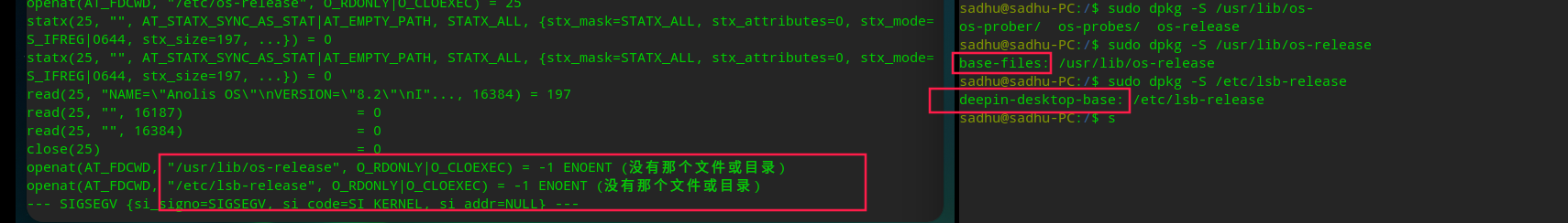 通过strace调试发现,没有找到 /usr/lib/os-release 和/etc/lsb-release,这两个包分别对应base-files 和 deepin-desktop-base 这个两个包仓库都没有。 |
