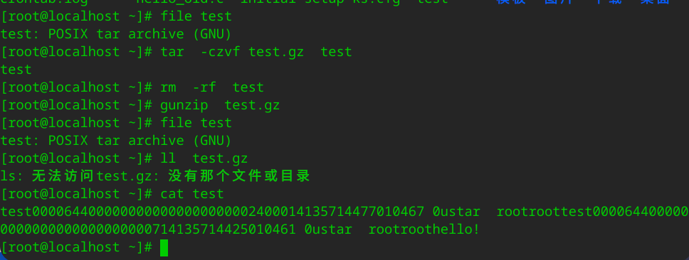 | 问题重现步骤 | 存在文件test的压缩文件,test.gz [root@XXX ~]# cat test hello! 1. 打开终端,输入命令压缩 [root@XXX ~]# gunzip test.gz 2. 查看解压文件 [root@XXX ~]# file test 3. 查看压缩文件 [root@XXX ~]# ll test.gz 4. 查看解压文件内容 [root@XXX ~]# cat test hello! [期望结果]: 1. 无错误信息输出。 2. 终端输出如下信息。 [root@XXX ~]# file test test: empty 3. 查找不到原文件,说明压缩文件被解压文件代替 [root@XXX ~]# ll test.gz ls: 无法访问test.gz: 没有那个文件或目录 4. 解压文件内容与原文件相同。 | ||||