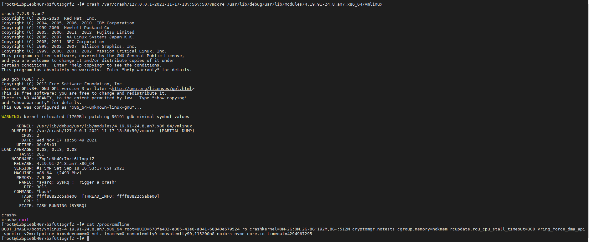 实例镜像: anolisos_7_7_x64_20G_anck_alibase_20211105.vhd anolisos_7_7_arm64_20G_anck_alibase_20211105.vhd 实例规格: x86_64 ecs.g6.large aarch64 ecs.g6r.large 解决方案: 更新发布高版本软件包: crash-7.2.8-3.an7 kexec-tools-2.0.15-51.1.an7.3 验证流程: 1. 安装新版本crash与kexec-tools软件包 2. systemctl restart kdump 3. 手动配置yum源并安装配套的kernel-debuginfo和kernel-debuginfo-common包 4. 通过grub2.cfg文件进而修改crashkernel为512M 5. echo c >/proc/sysrq-trigger触发异常 6. 待重新连接后,通过crash对vmcore进行解析且解析正常 验证结果见图 |
