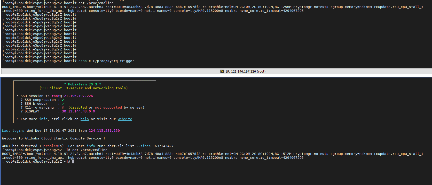 关于设置crashkernel=256M ,crash 后导致系统不能正常启动, 建议参考 alinux2 的 kexec-tools ,发布 kexec-tools-2.0.15-51.1.al7.3.alnx.aarch64 来修复该问题 |