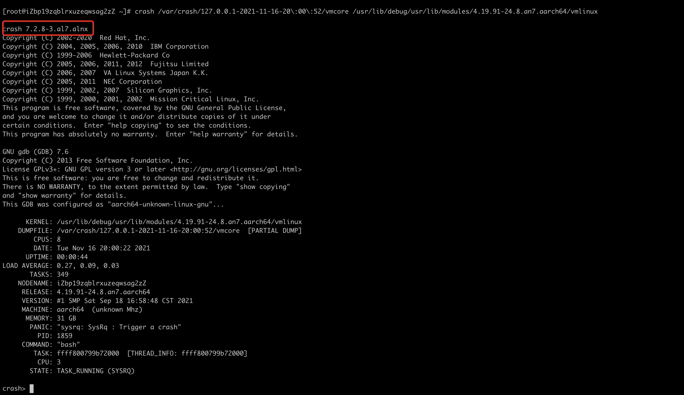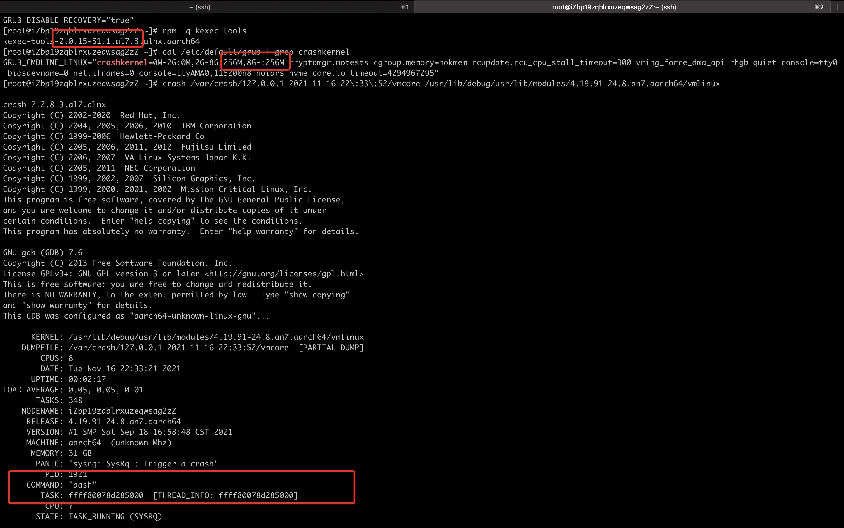 | 问题重现步骤 | 1、使用镜像 anolisos_7_7_arm64_20G_anck_alibase_20211105.vhd 安装云上实例 ecs.g6r.large 或 ecs.g6r.16xlarge 2、查看/proc/cmdline,crashkernel默认为256M,使用echo c >/proc/sysrq-trigger 触发crash,查看是否可以在重启后正常进入系统 3、设置crashkernel为512M,再次触发crash,安装kernel-debuginfo包后解析vmcore文件,查看是否可以正常解析 | ||||