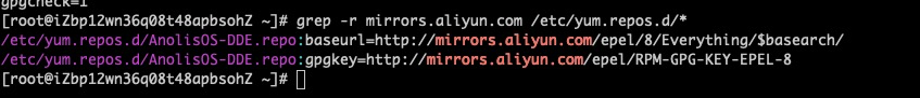应该是anolis-dde.repo 这个文件里面配置的 epel 导致的 [root@iZbp12wn36q08t48apbsohZ ~]# cat /etc/yum.repos.d/AnolisOS-DDE.repo [DDE] name=AnolisOS-$releasever - DDE baseurl=http://mirrors.cloud.aliyuncs.com/anolis/$releasever/DDE/$basearch/os enabled=0 gpgkey=file:///etc/pki/rpm-gpg/RPM-GPG-KEY-ANOLIS gpgcheck=1 [epel] name=epel baseurl=http://mirrors.aliyun.com/epel/8/Everything/$basearch/ enabled=0 gpgkey=http://mirrors.aliyun.com/epel/RPM-GPG-KEY-EPEL-8 gpgcheck=1 |