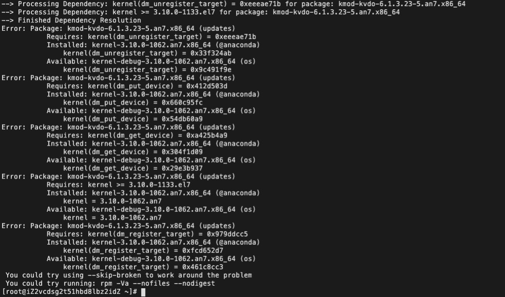 | 问题重现步骤 | 1. 在anolis上使用yum命令安装 kmod-kvdo 2. 安装报错,报错信息中显示 “Processing Dependency: kernel >= 3.10.0-1133.el7 for package: kmod-kvdo-6.1.3.23-5.an7.x86_64” | ||||