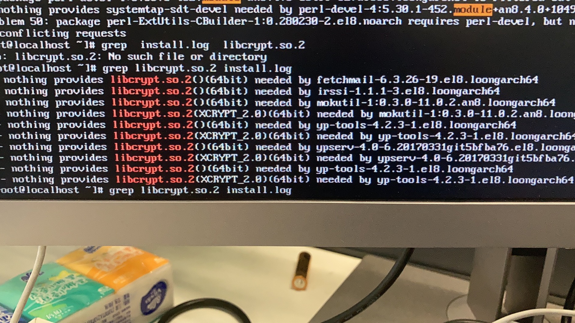 | 描述 | libcrypt.so.2()依赖fetchmail ,irssi,mokutil,yp-tools,ypserv而fetchmail ,irssi,mokutil,yp-tools,ypserv用的是libcrypt.so.1()因此需要重新编译这些包 | ||||