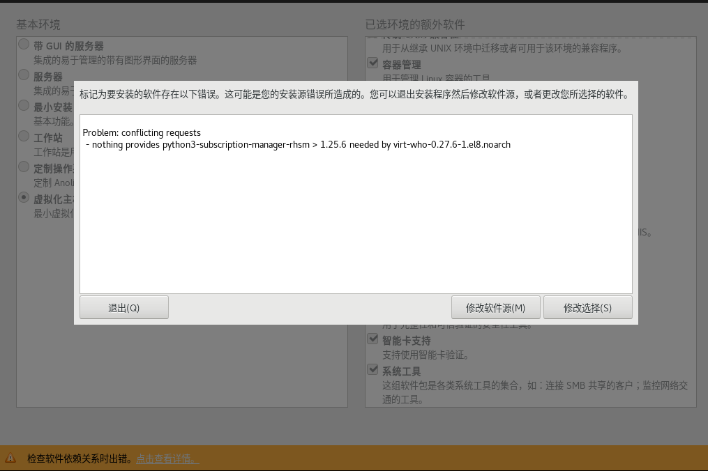 | 描述 | 在海光服务器安装Anolis系统,选择"虚拟化主机"报错 | ||||