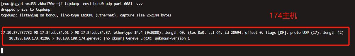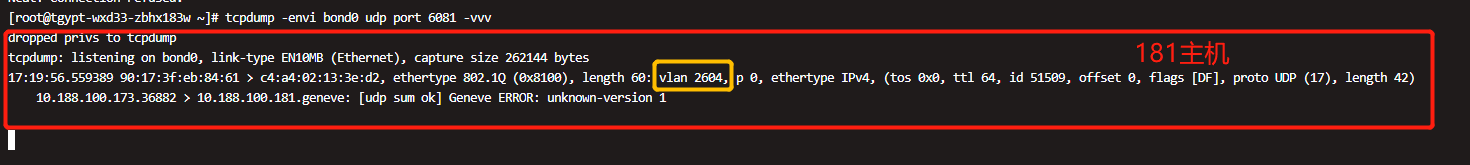 | 问题重现步骤 | 【环境】anolis8.2 系统+taishan2280V2板载网卡(海思hns3芯片) 【复现步骤】 当时抓的是UDP 6081 UDP测试 client端: #~ echo "Hello from PC" | nc -w1 -uv xx.xxx.100.174 6081 server端: #~ nc -u -l -p 6081 某台主机抓包: tcpdump -envi bond0 udp port 6081 -vvv 【结果】 1. 测试小于64B的数据包(有Vlan标签)通过板载网卡发送到4789或6081这两个端口时没有vlan标签,大于64B的数据包正常 2. NC工具64字节包含以下大小包也收不到 (具体故障现象可查看附件抓图) 【期望结果】小于64B的数据包也正常带有VLAN标签。 | ||||